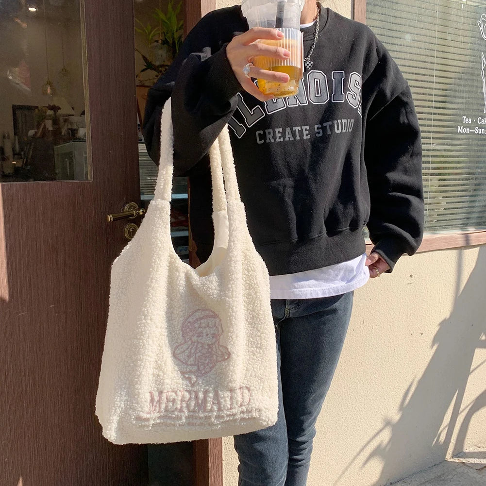 INS Mermaid Dolphin Print Tote Bag Soft Plush Shoulder Bag