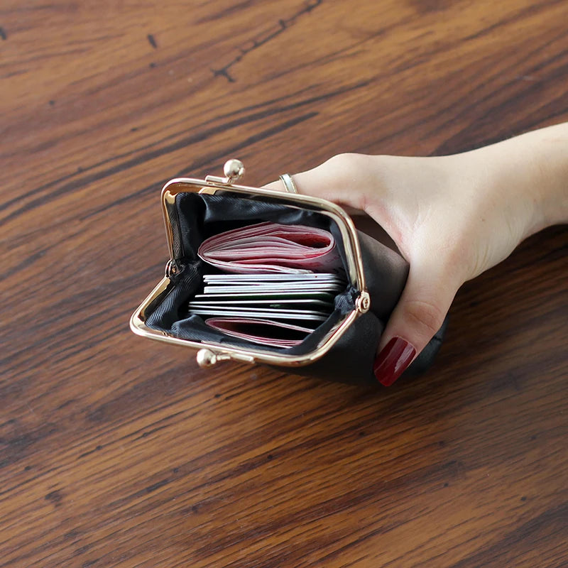 This small women's wallet is made of high-quality oil wax leather with a stylish buckle clip design. It can hold coins, cards, cash, and even small items like a headset. Perfect for on-the-go use.