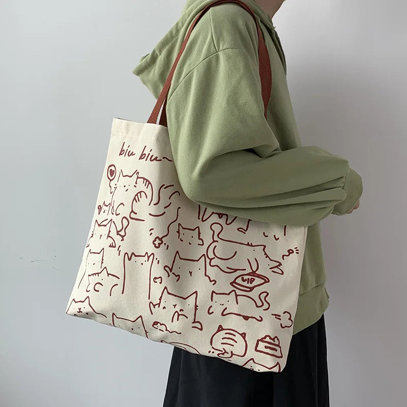 Japanese Style Cat Dog Tote Bag Hand Painted Canvas Shopper Zipper Shoulder Bags