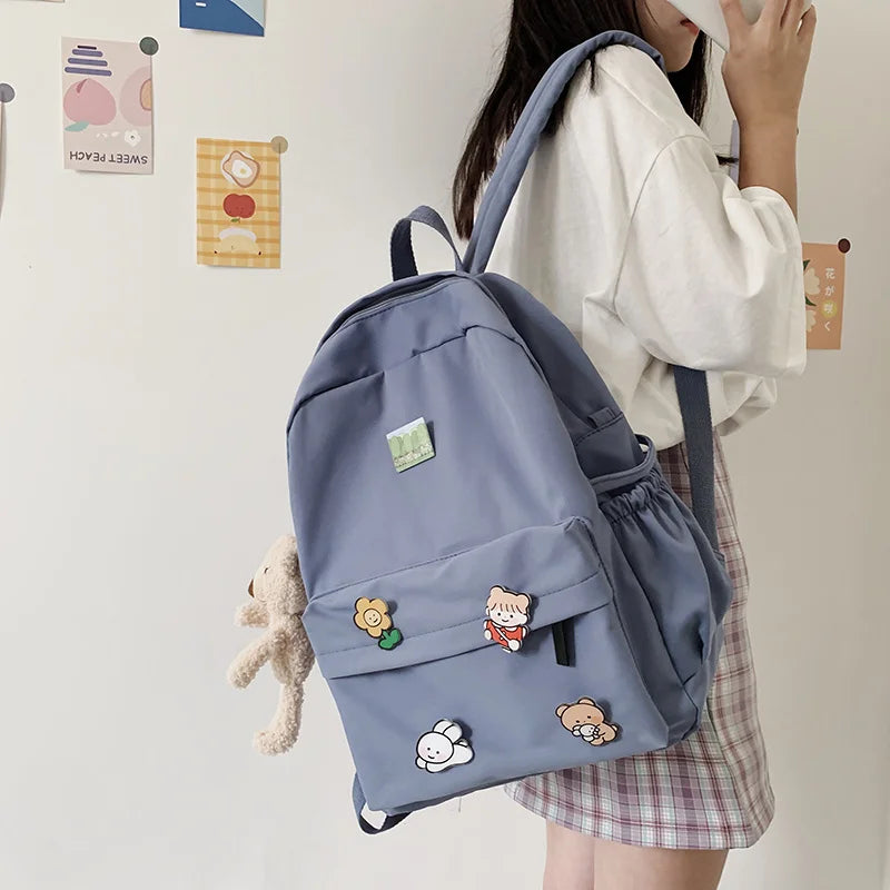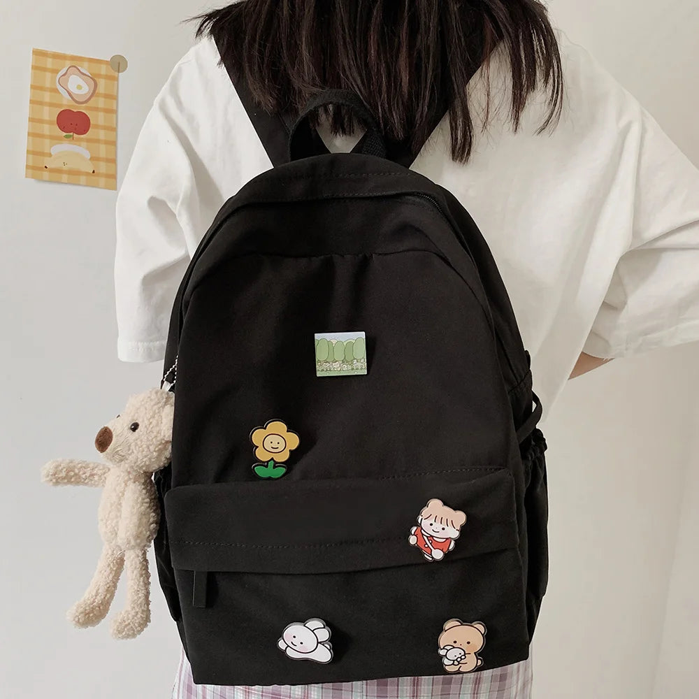This cute and kawaii bear nylon backpack is perfect for female students. It features a unique badge and doll design, ideal for carrying books and essentials to school or college.