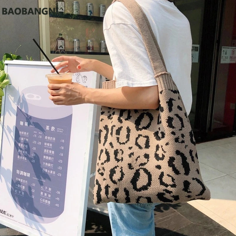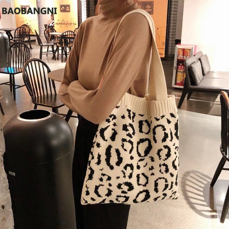 Stay stylish while shopping with this Leopard Knitting Tote Shoulder Bag. The large capacity and soft material make it the perfect accessory for carrying all your essentials.