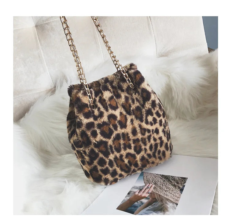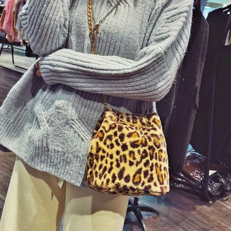 Leopard Print Mini Chain Bucket Bag Plush Messenger Bag