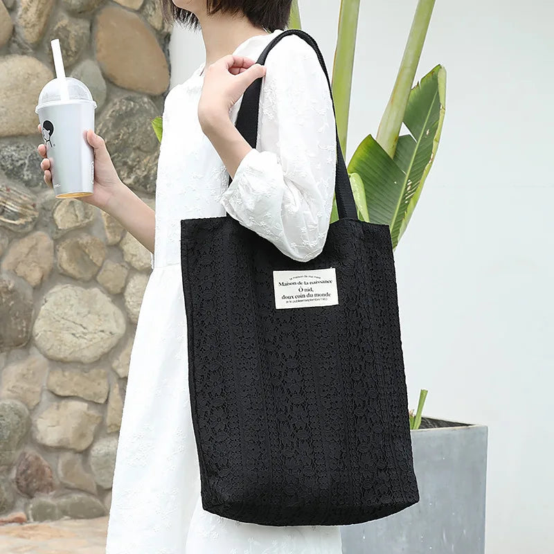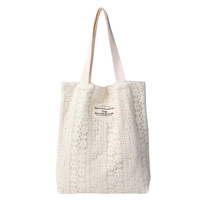 This stylish handbag features a literary canvas design with letter printing and lace detailing. Ideal for leisure outings, the hollowed out shoulder bag offers a trendy and chic look.