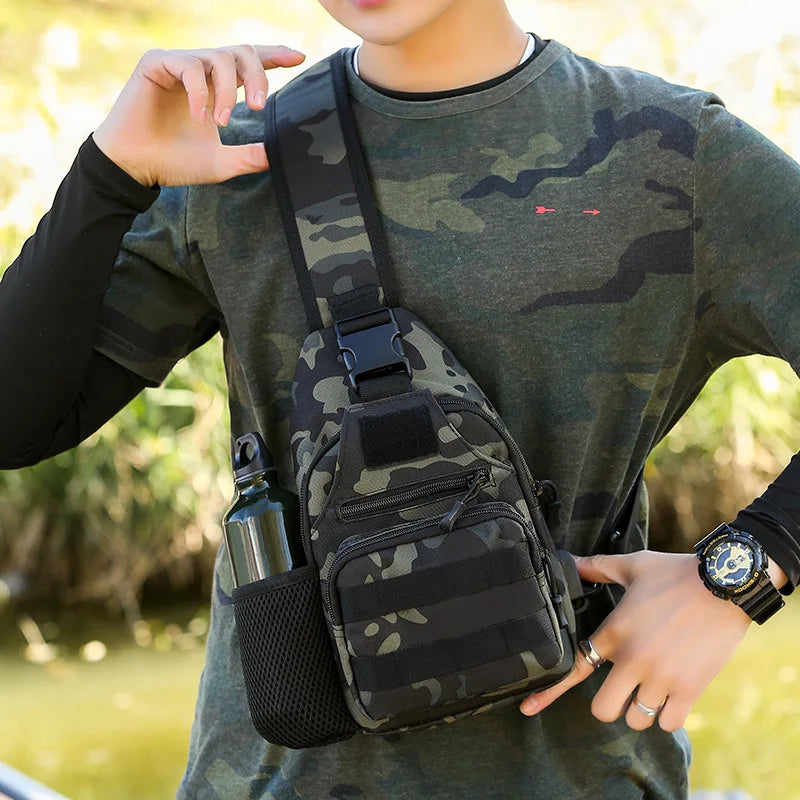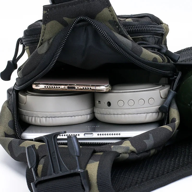 This multi-functional cross bag is perfect for outdoor activities. It features a camouflage design and tactical style for a rugged look.