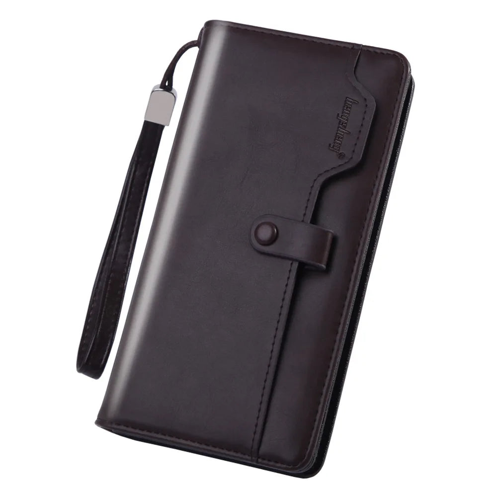 This men's clutch wallet is designed for convenience with multiple compartments to hold money, cards, and a phone. The zipper closure ensures secure storage.
