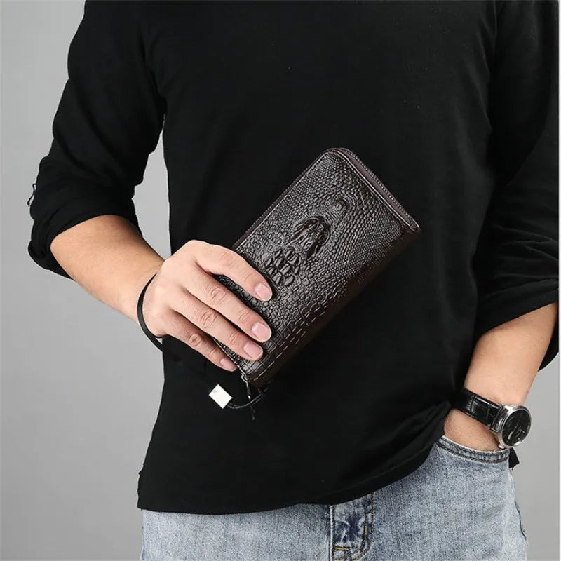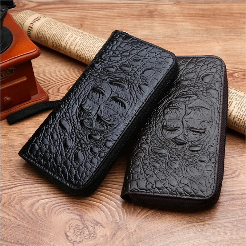 This men's wallet features a crocodile pattern design with a single zipper and a mobile phone bag. It offers high capacity and is perfect for business use with its multi-functionality.