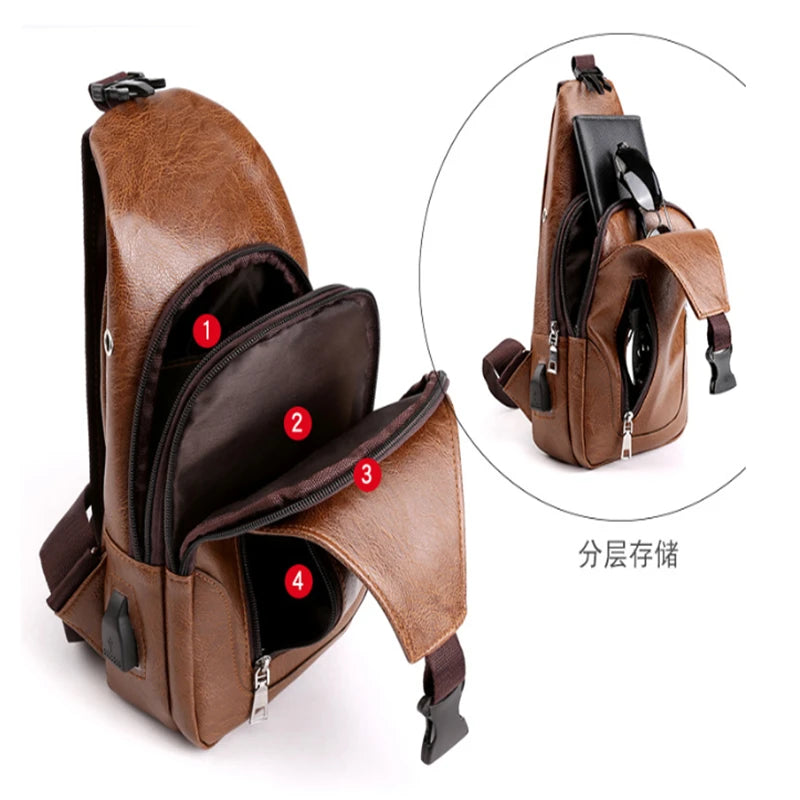 Stay organized with this stylish Men's Leather Chest Bag featuring USB charging capability. Perfect for travel, work, or everyday use.