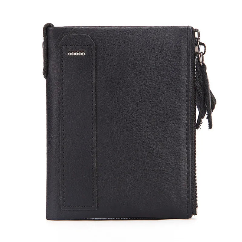 Description:Keep your essentials organized in style with this men's short wallet made from first layer oil wax leather. It features two zipper compartments for coins and multiple card slots.Features: Crafted from high-quality first layer oil wax leather Double zipper design for separate coin storage Multiple card slots for easy organization...