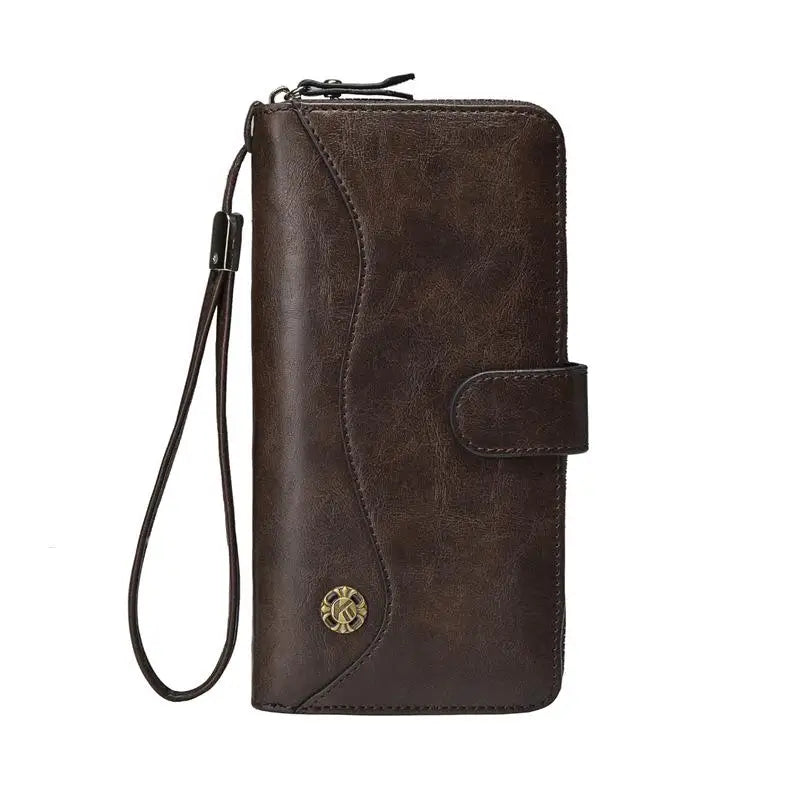 Stay organized with this stylish leather wallet for men featuring a zipper closure, large capacity, and a convenient hand strap. Ideal for business use.
