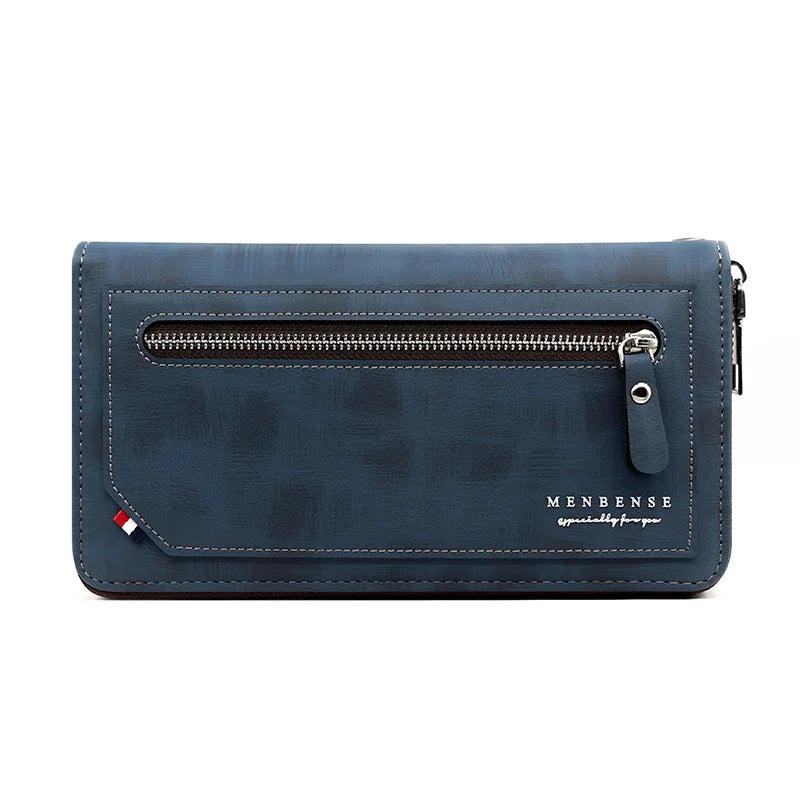 This men's long wallet is made of high-quality collated leather with a casual design. It features a zipper closure, multiple card slots, and a mobile phone pocket.