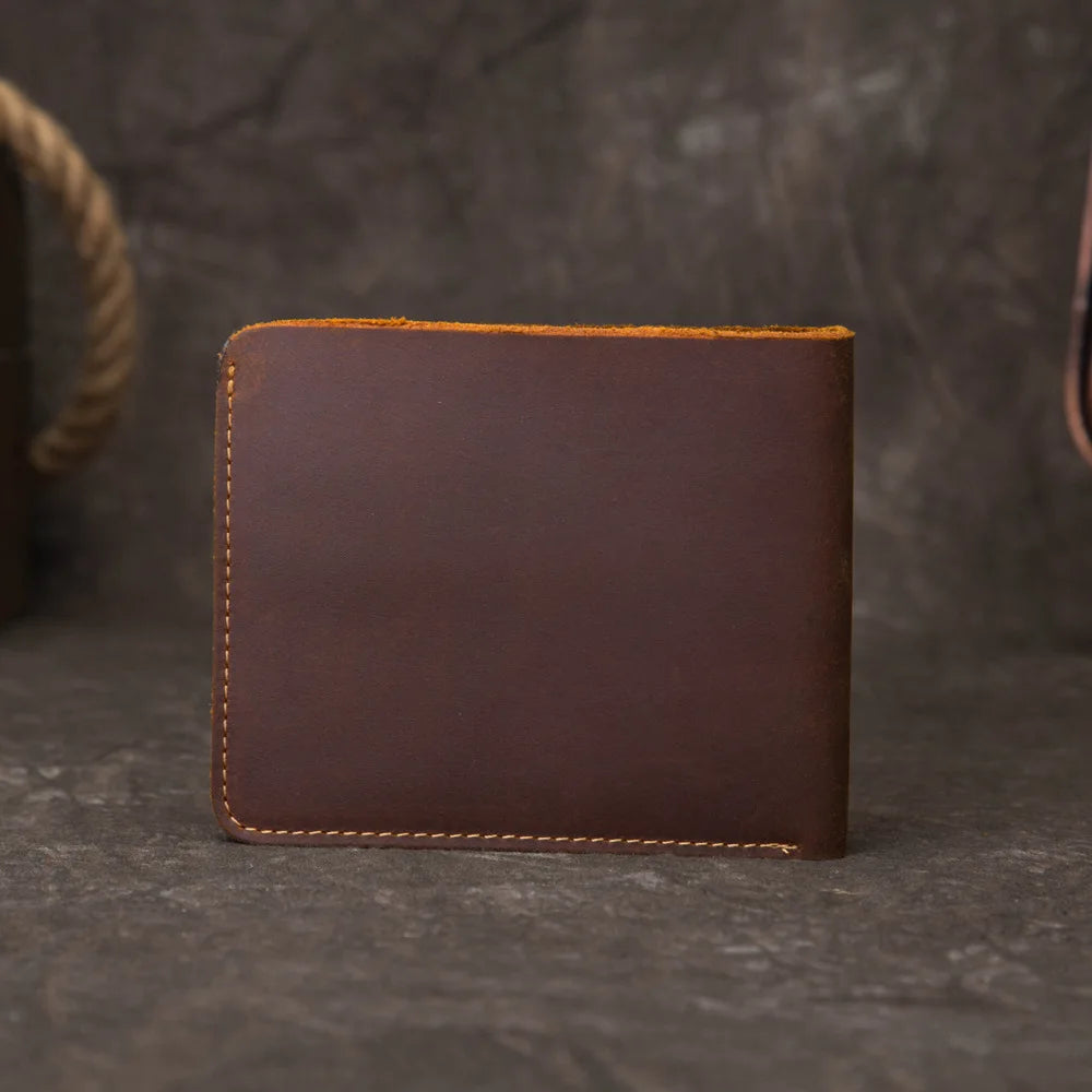This wallet is made of first layer cowhide with a vintage look. It features multiple card slots and is crafted from crazy horse leather for durability.