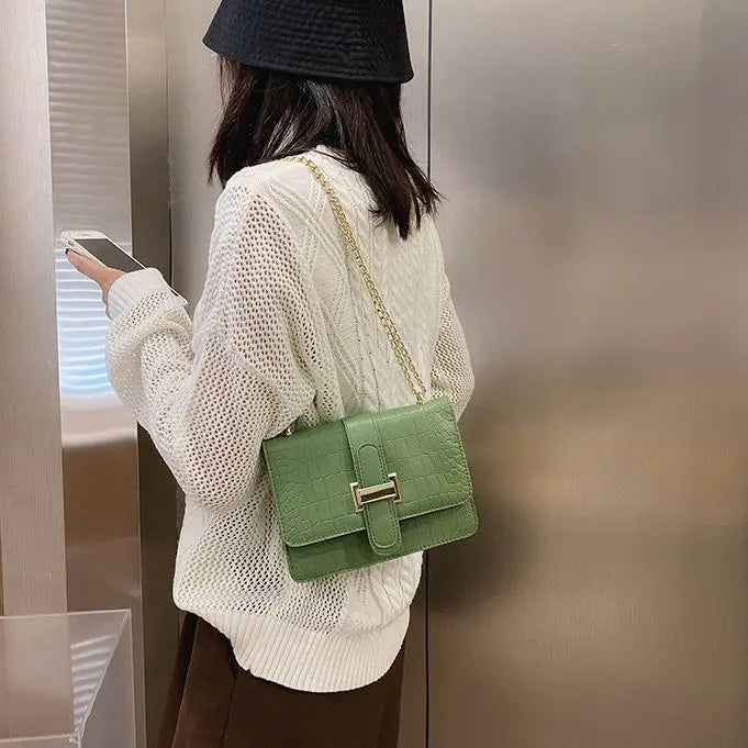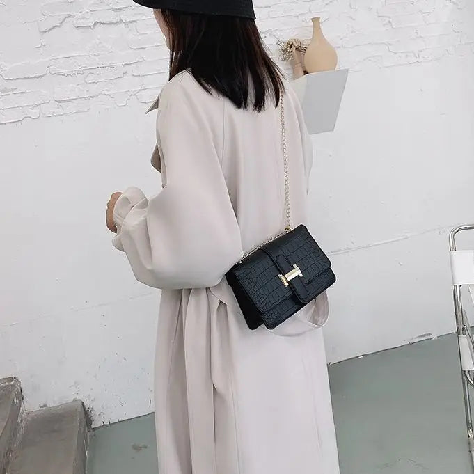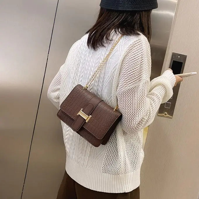 This mini square flip bag is made of high-quality PU leather with a stone pattern lock. It features a chain shoulder strap for added style and convenience.