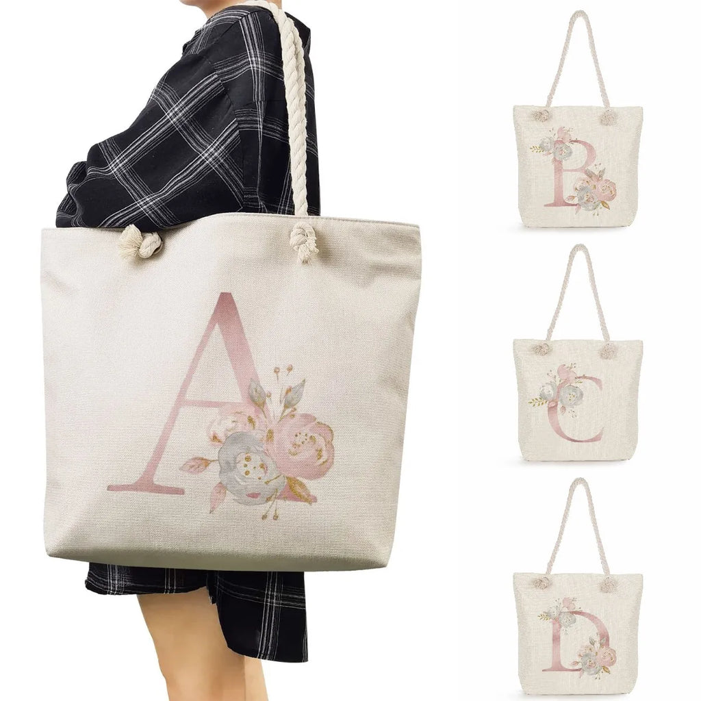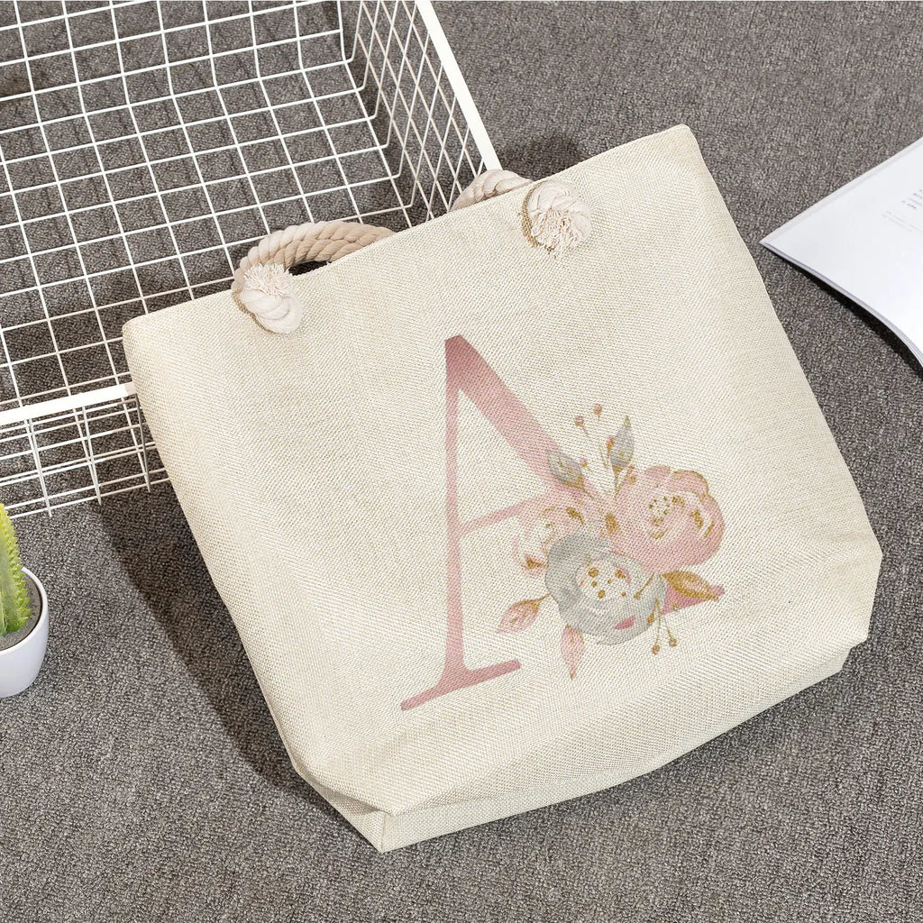 This stylish reusable tote bag features a thick rope shoulder strap with a 26 letters floral print design, perfect for carrying your essentials.