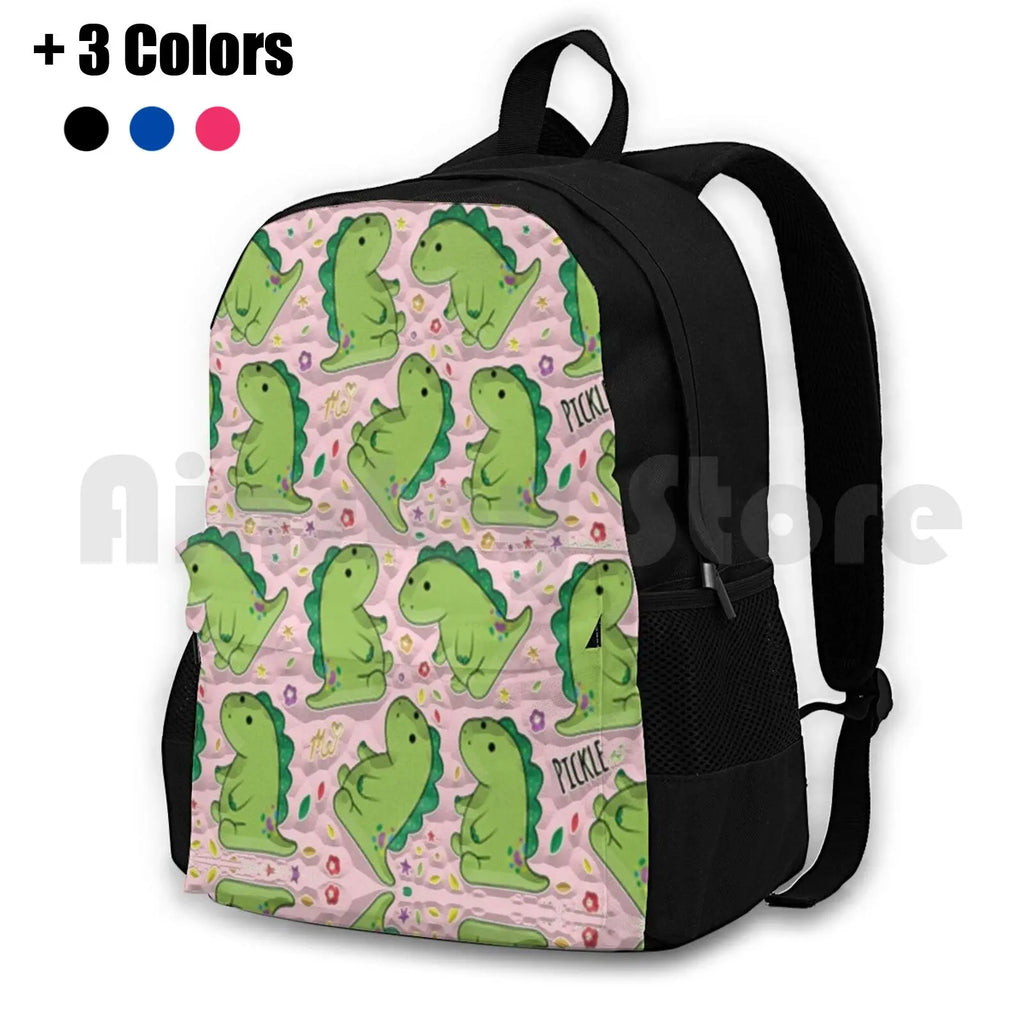 Stay prepared for your outdoor adventures with the waterproof camping travel backpack featuring the adorable Pickle the Dinosaur design by Moriah Elizabeth.