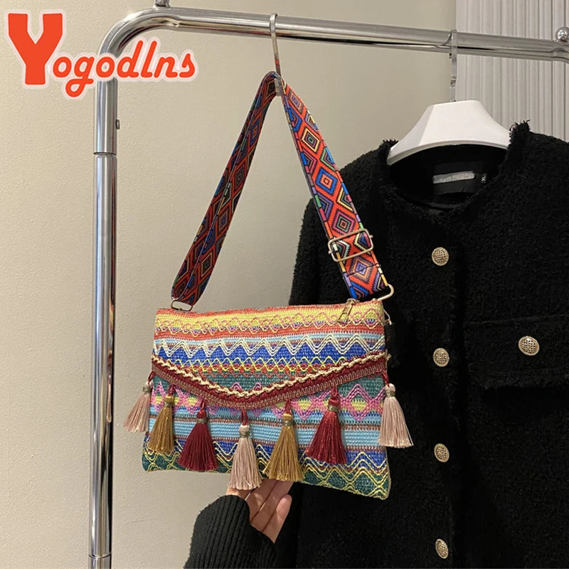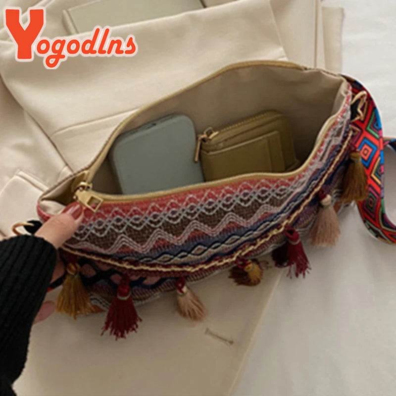 Vintage cotton crossbody bag with tassel design, perfect for women on-the-go.