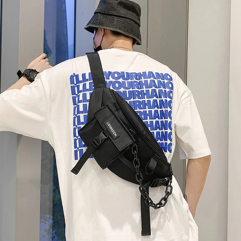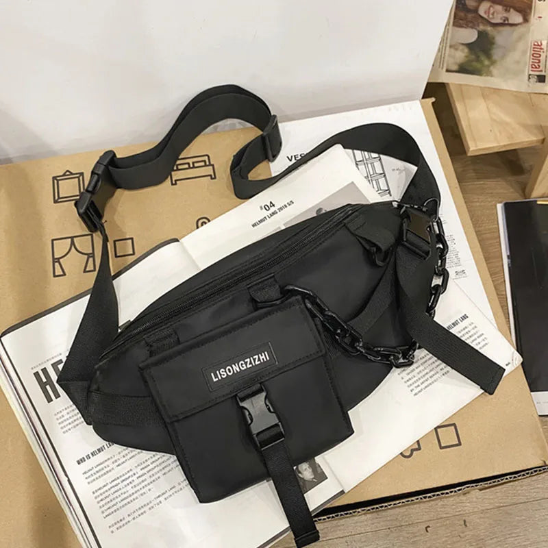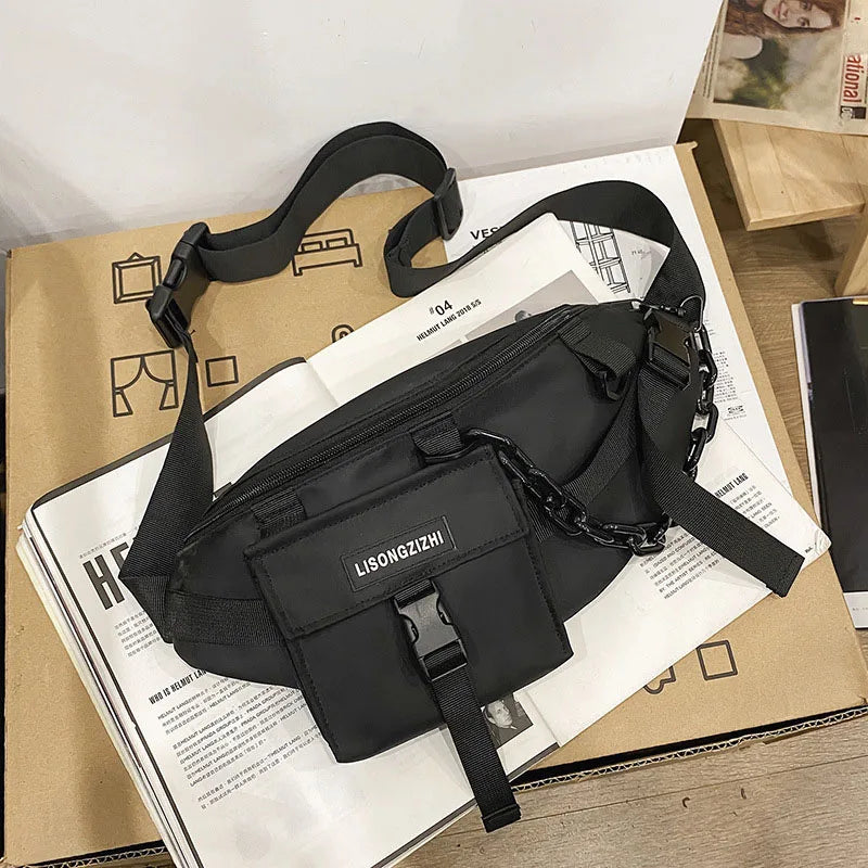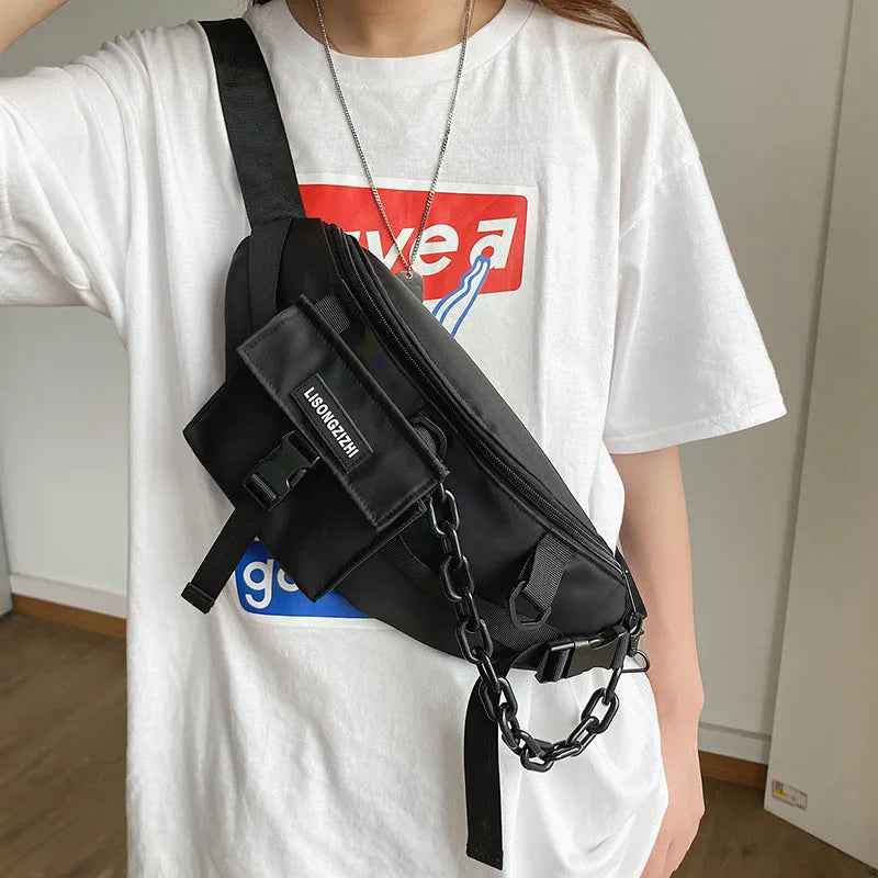 Stay on trend with this versatile nylon fanny pack, suitable for hip hop lovers. Features a waist belt and chain for added style.