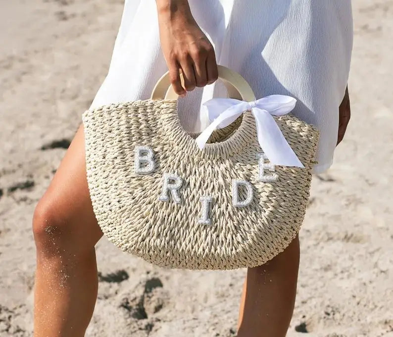 Personalized Straw Tote Bag for Bride, Beach Bridal Shower Bag