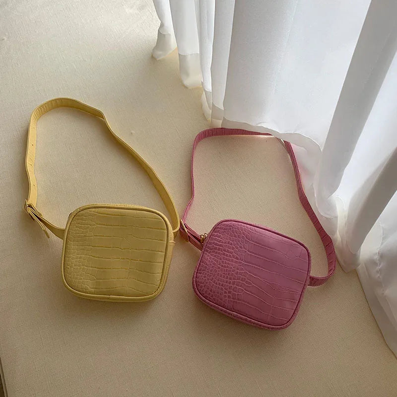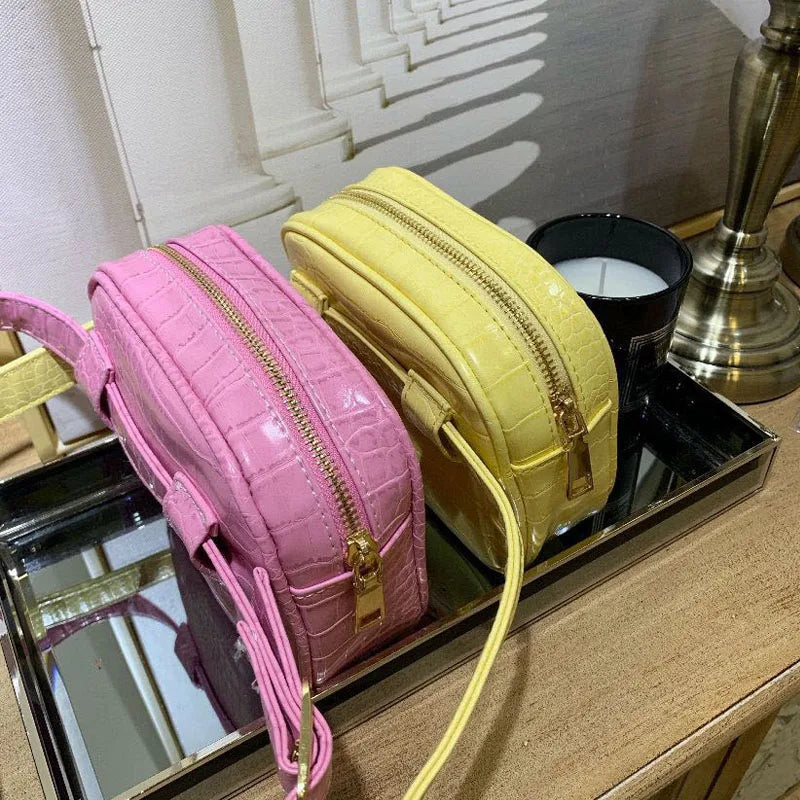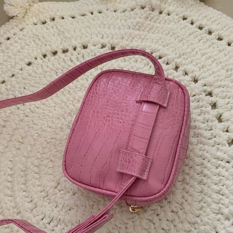 This stylish pink crocodile pattern leather handbag is perfect for keeping your essentials organized. It can be worn as a chest bag, messenger bag, or waist pack.