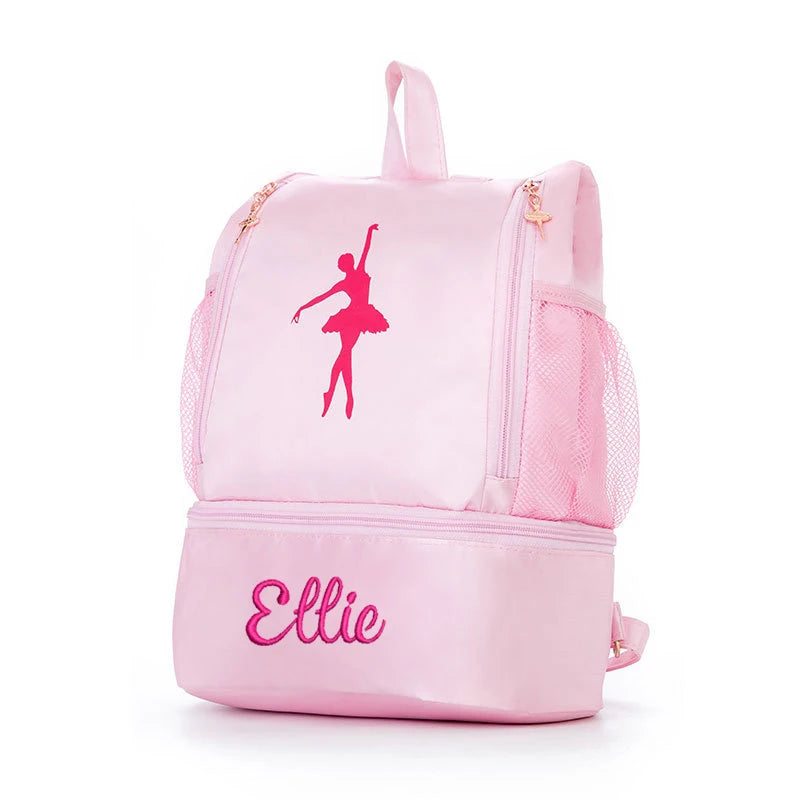 Description:This personalized pink dance bag is perfect for young ballerinas, featuring an embroidered name. The bag is ideal for ballet, dance, gymnastics, or any other activities.Features: Embroidered with your child's name for a personal touch Ideal for ballet, dance, gymnastics, or everyday use Spacious main compartment for storing dance essentials...