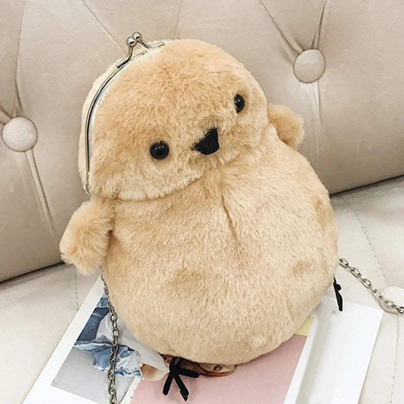Adorable plush chicken handbag with metal chain shoulder strap. This lovely animal purse is perfect for women and doubles as a plush stuffed toy bag.