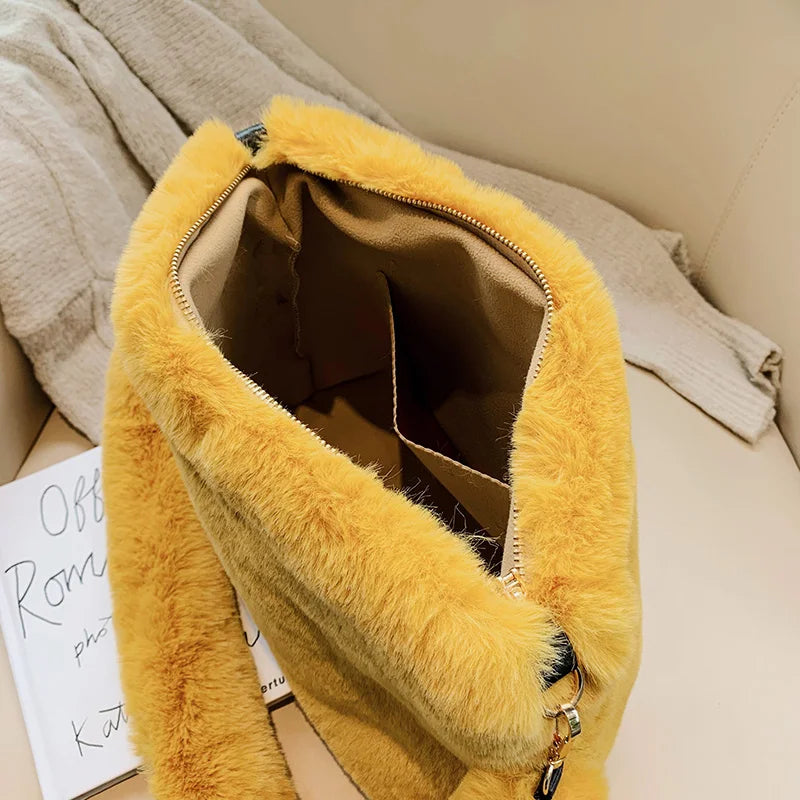 Stay stylish and cozy with this winter handbag featuring a soft fur design. This hobo bag offers a large capacity for all your essentials. Perfect for the fashionable lady.