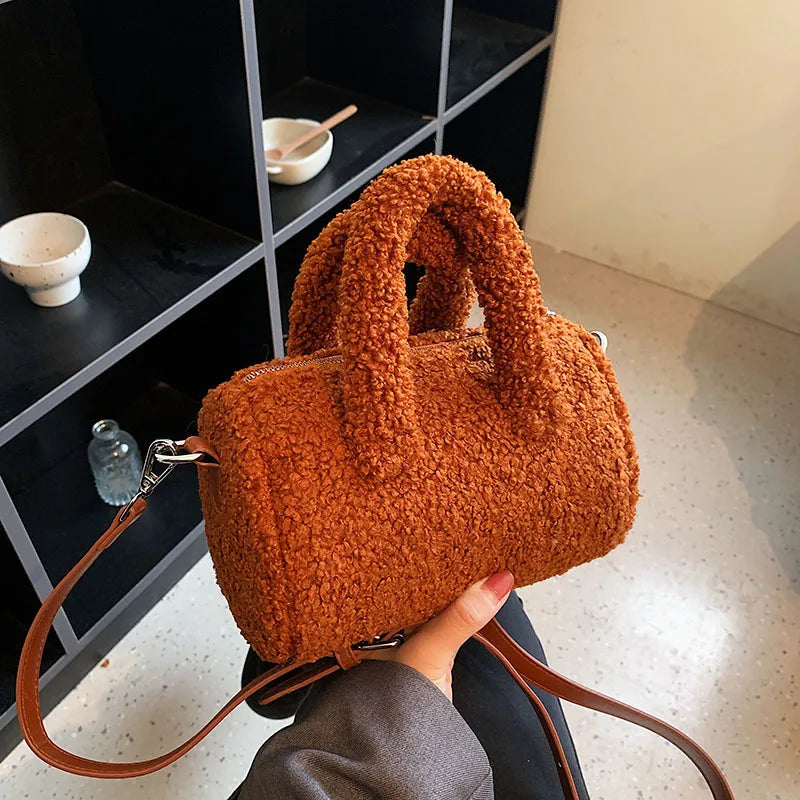 Stay warm and stylish with this small round crossbody shoulder bag featuring a soft plush material. Perfect for winter days!