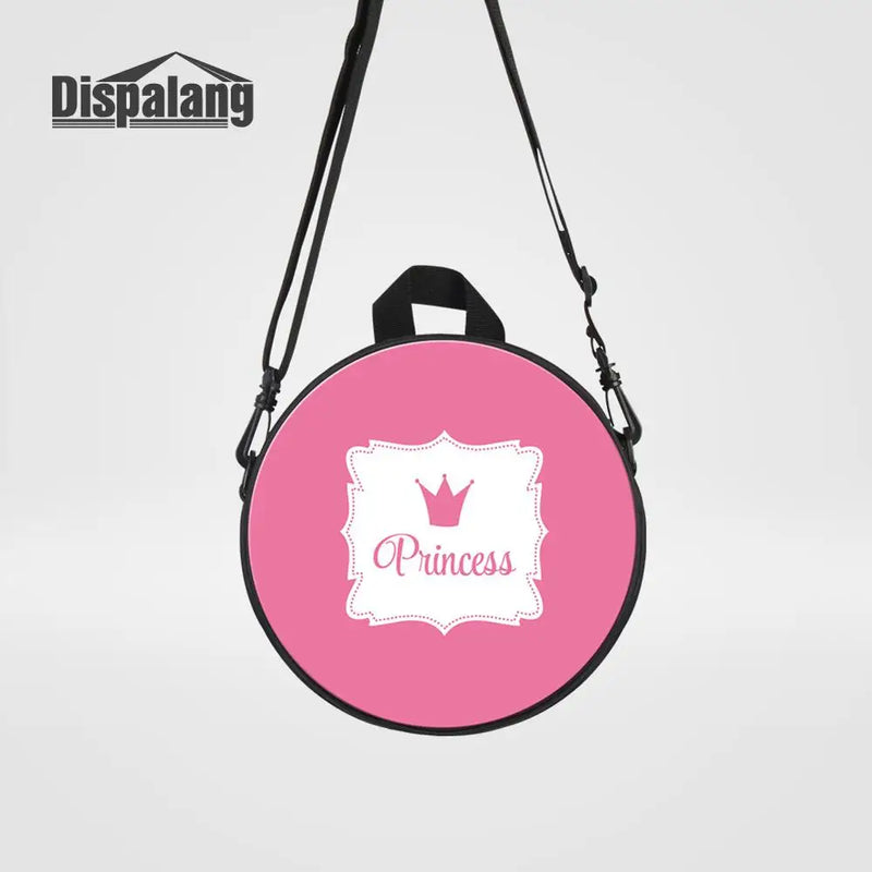 Adorable mini circular messenger bag with princess crown print, perfect for kindergarten. Ideal round schoolbag for young girls.