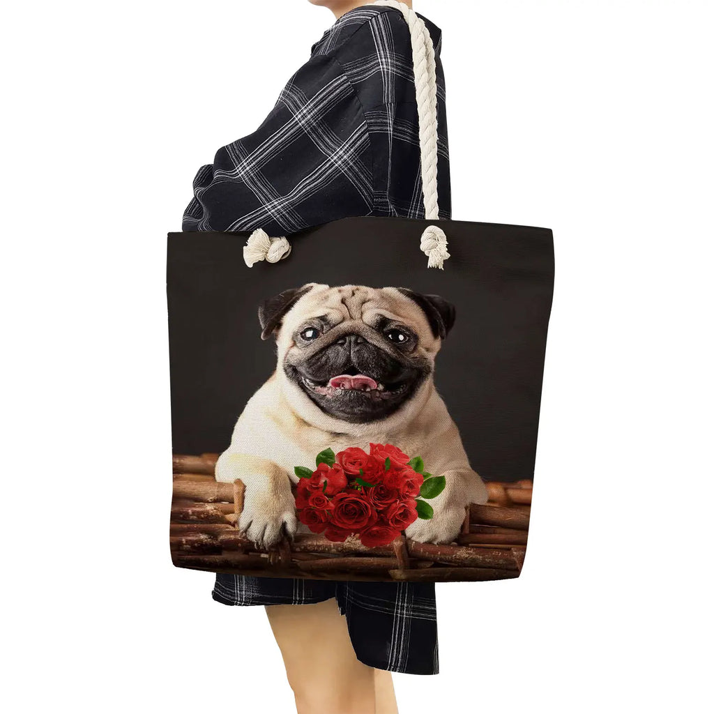 Pug Dog Print Shopping Bag Animal Graphic Polyester Fabric Shoulder Bag