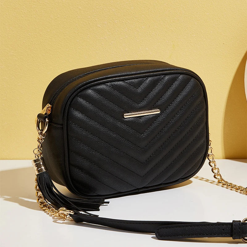 Stay stylish with this quilted shoulder crossbody bag featuring tassel detail. It's designed for women on the go, with a small size that's perfect for carrying essentials. The chain strap adds a chic touch to any outfit.