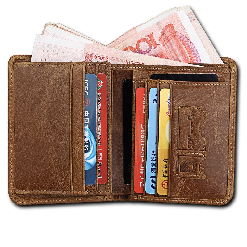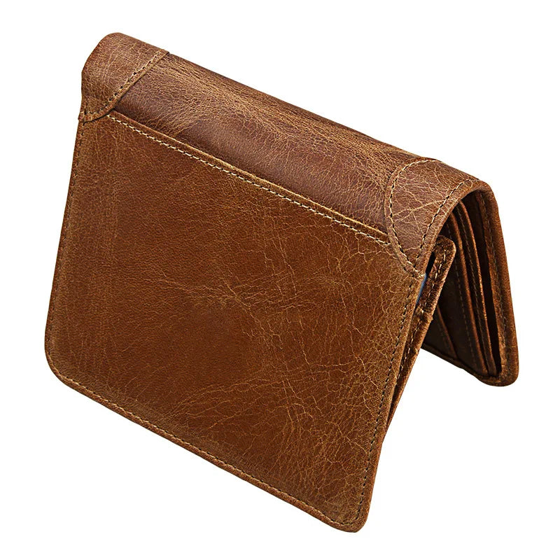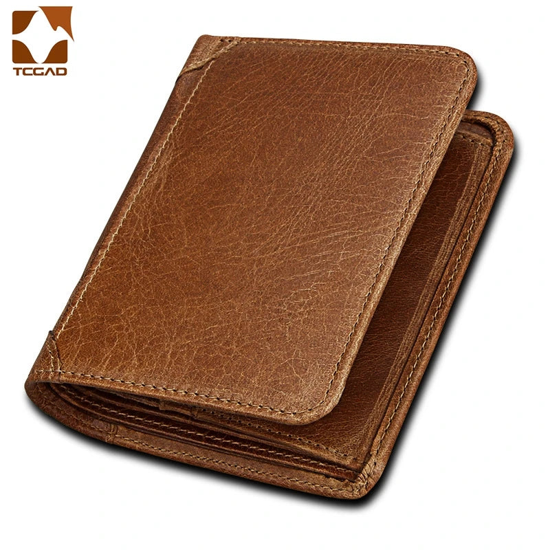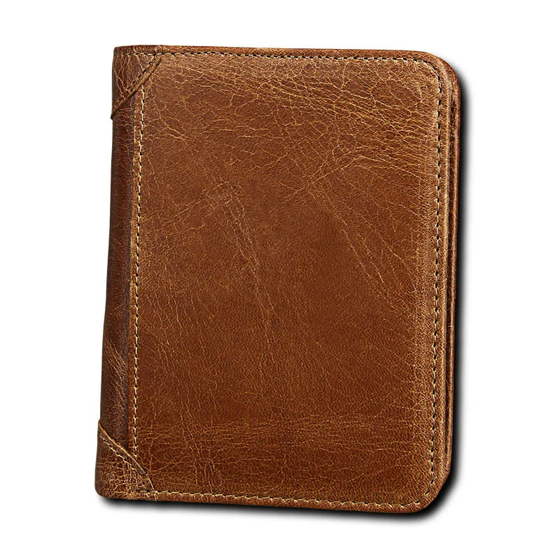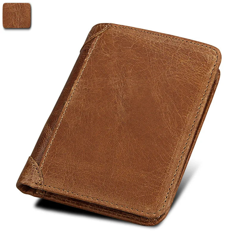 This men's leather wallet is designed with a retro style and features RFID protection. It comes with a matching box, making it a great gift option.