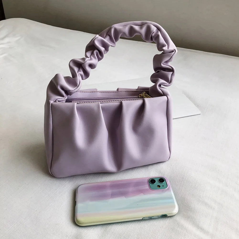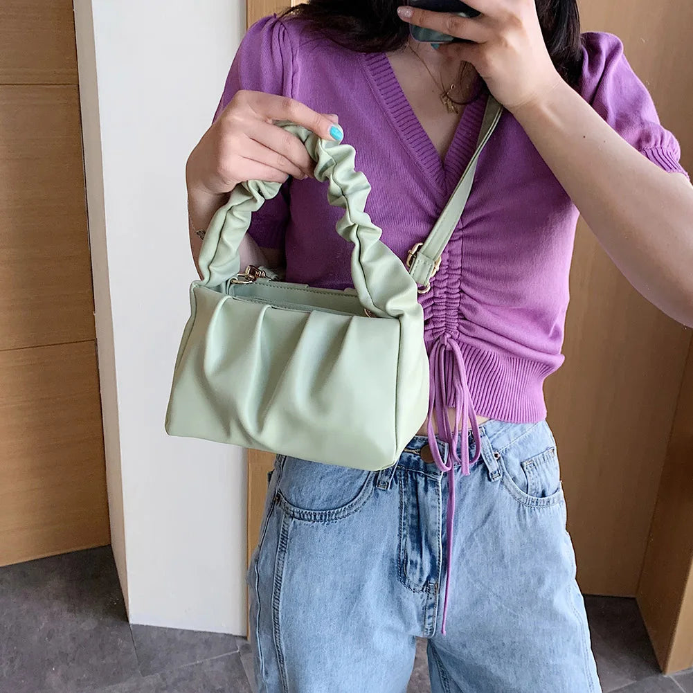 Vintage-style candy shoulder bag crafted from high-quality PU leather with pleated ruffle design. A classic handbag for women.