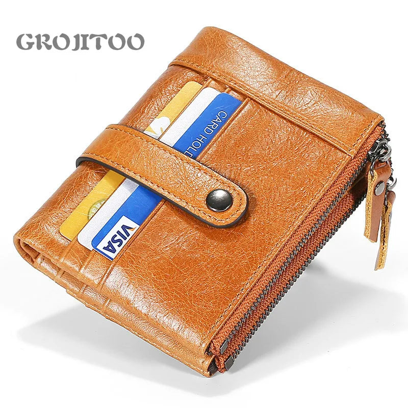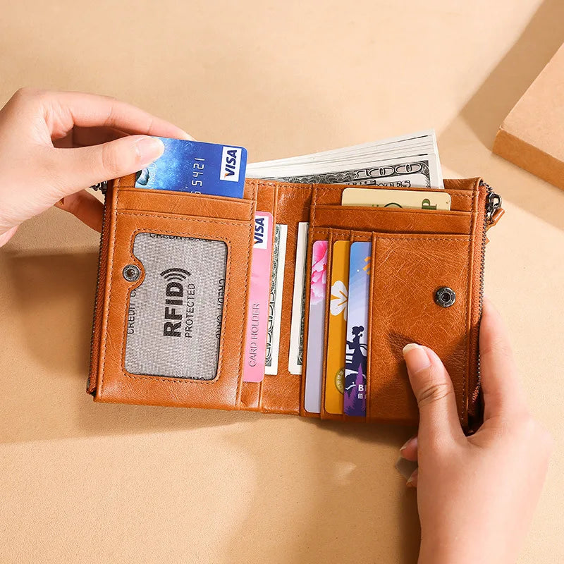Keep your valuables secure with this RFID anti-theft leather wallet featuring a double zipper design.