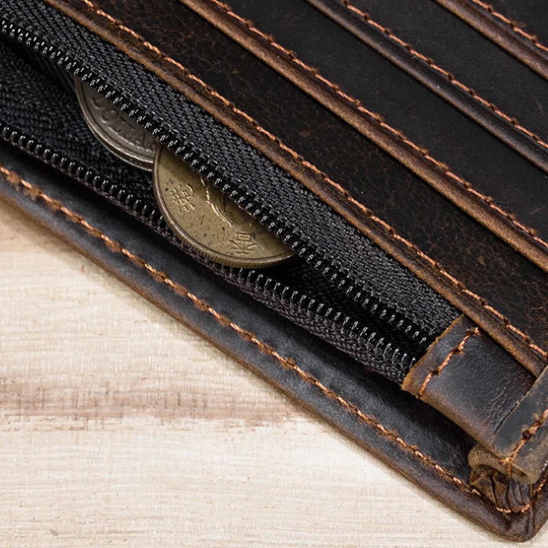 This bifold wallet is made of Crazy Horse leather, perfect for travel and everyday use. It features an ID window and RFID blocking technology.