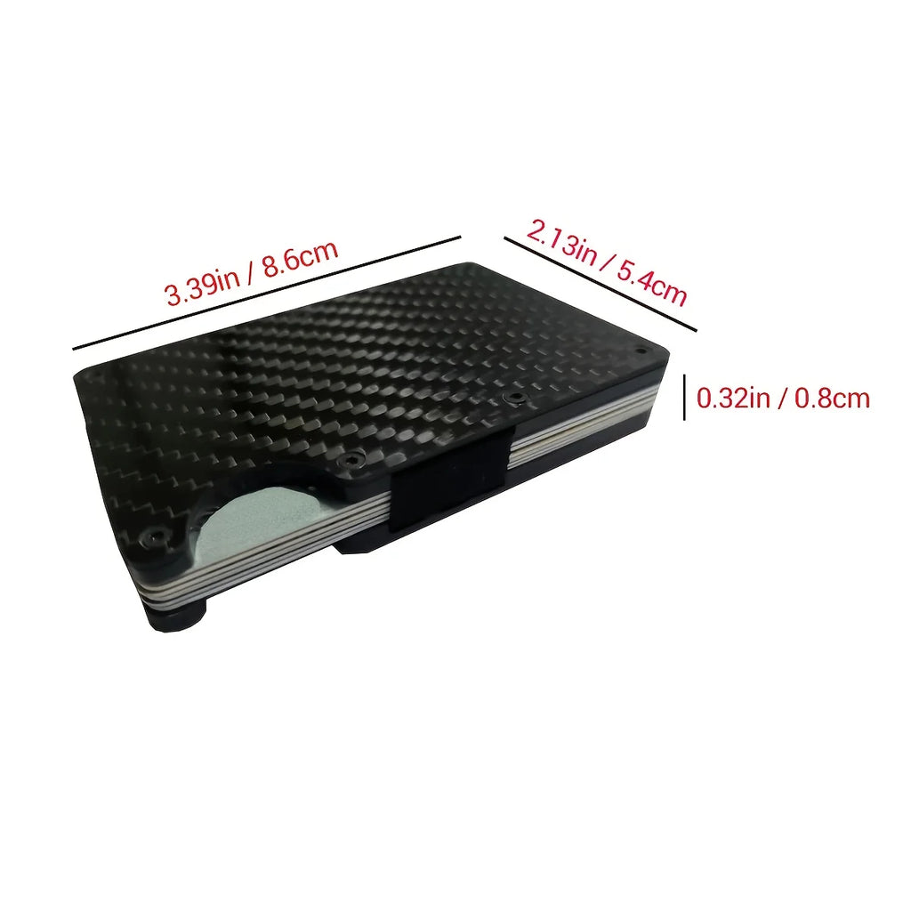 Description:This sleek and modern money clip wallet is made from carbon fiber and aluminum, providing durability and style while protecting your cards from RFID skimming.Features: RFID-blocking technology to keep your cards safe Lightweight and compact design for easy carry Constructed from carbon fiber and aluminum for durability Money clip feature...
