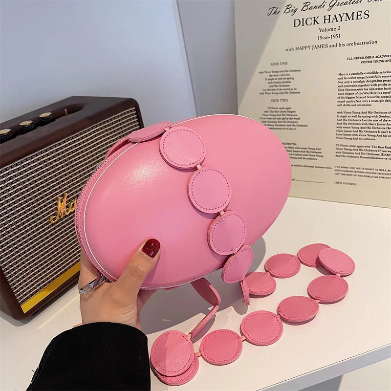 Elegant round handbag with a shoulder strap, perfect for parties or evenings out. Available in green and pink.