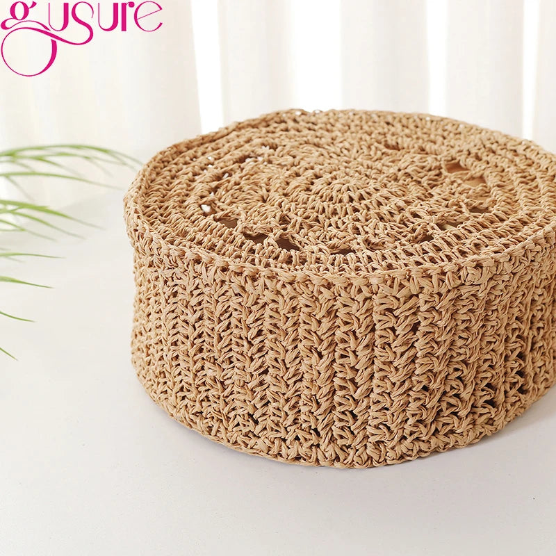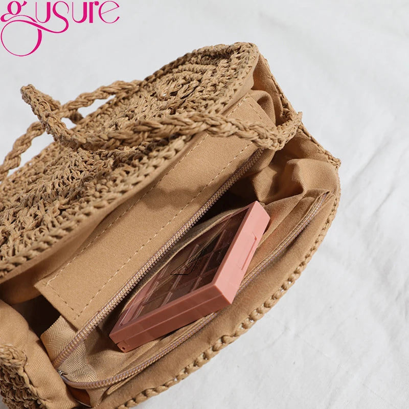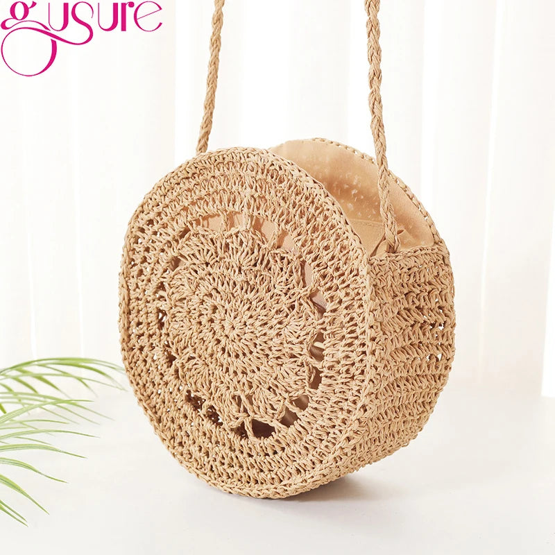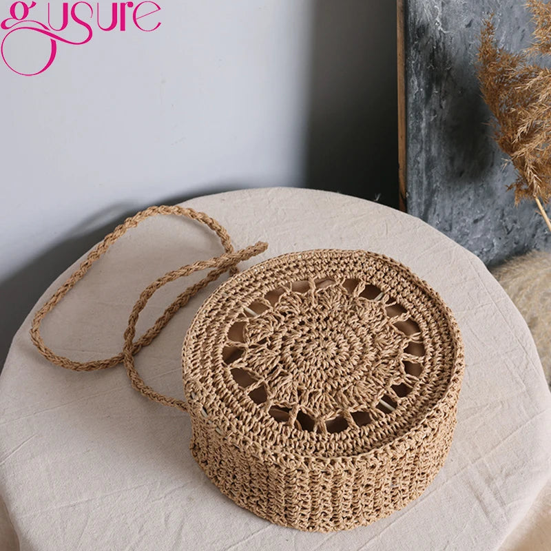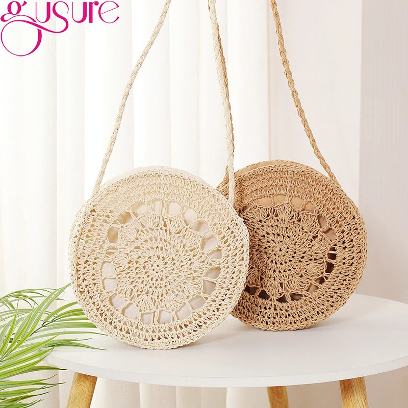 Round Rattan Woven Straw Crossbody Bag Hollow Shoulder Bags
