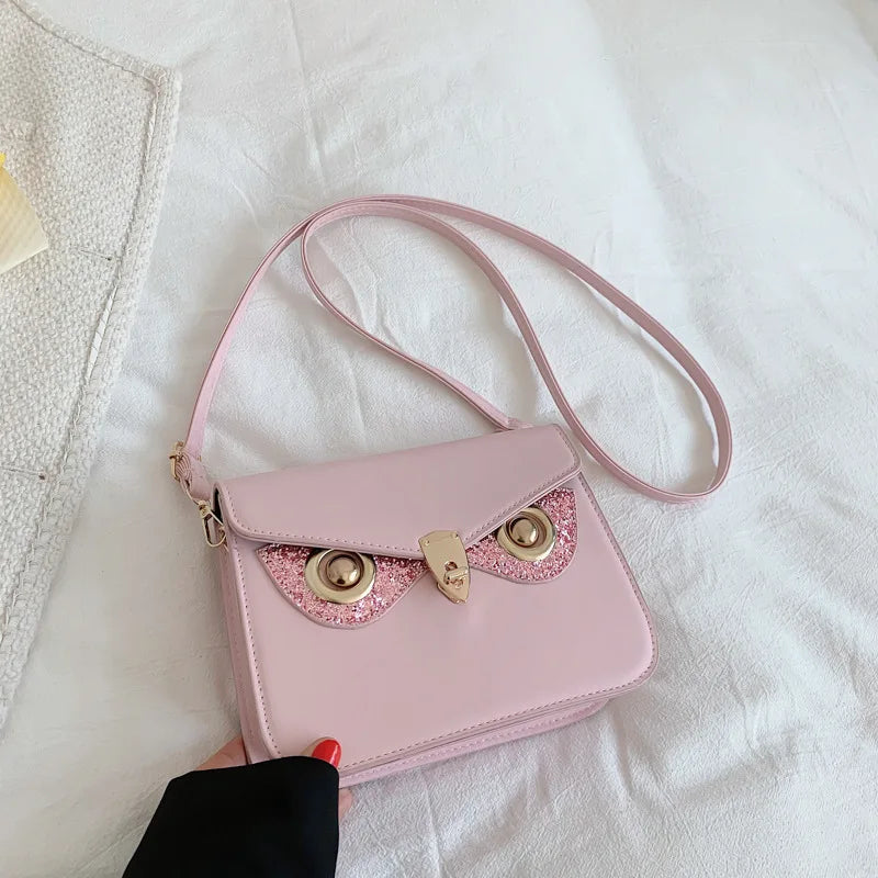 This female PU leather small square bag is stylish and elegant with a sequined owl design. It features a flap shoulder design, chains for added style, and can be used as an armpit bag.