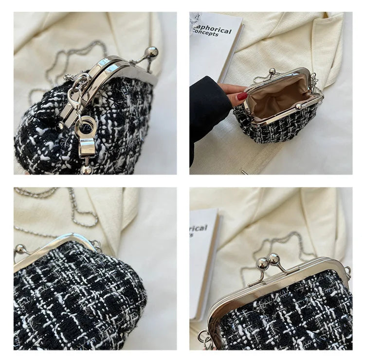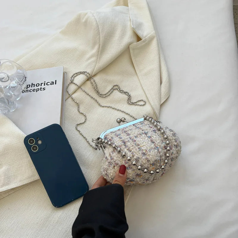 This stylish handbag is perfect for the fall and winter seasons. It features a shell-shaped design with beads and chains, made from high-quality PU leather and tweed material.