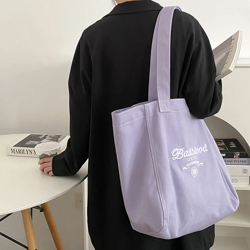 Stay stylish and eco-friendly with this casual canvas shoulder bag featuring letter embroidery. This reusable tote has a spacious interior for all your shopping needs.