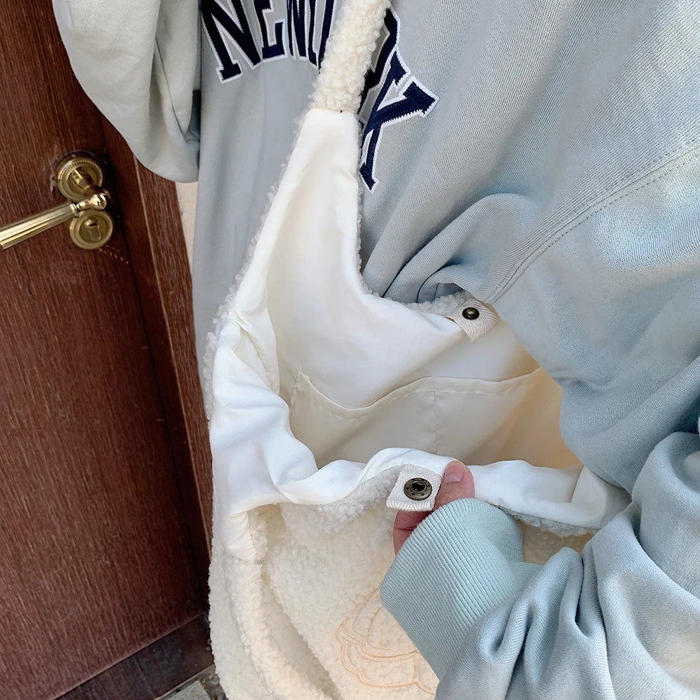 Soft Fleece Plush Handbag Mermaid Dolphin Embroidery Shoulder Tote Bag