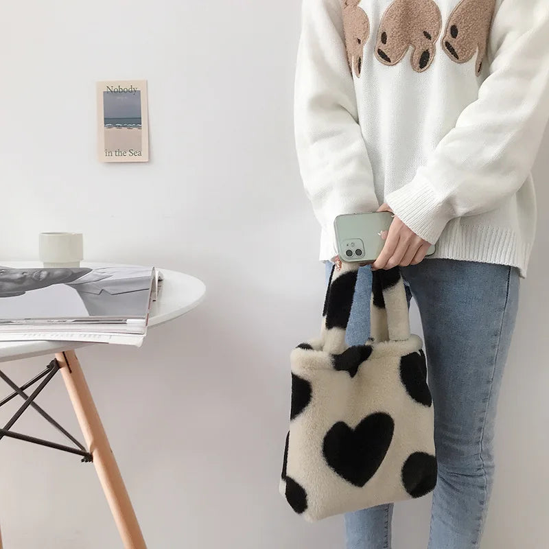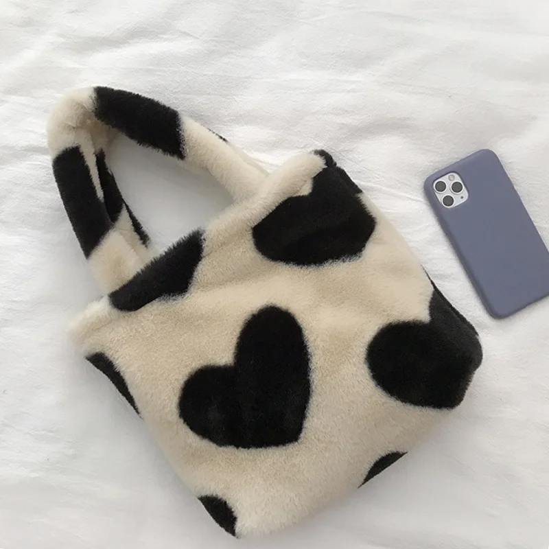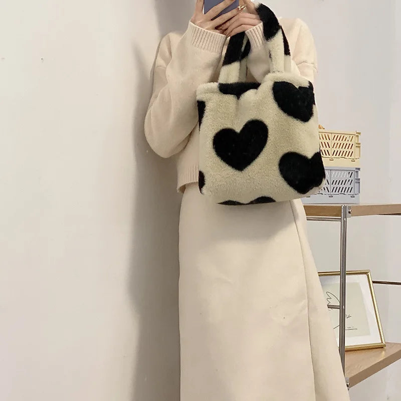 This small shoulder bag is perfect for Y2K girls with its plush faux fur design and love heart detail. Carry it as a clutch purse or handbag for a stylish look.