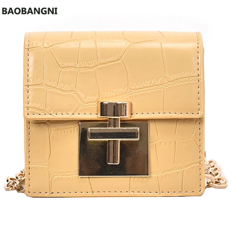 This stylish mini square crossbody bag features a stone pattern design and is made of high-quality PU leather. It comes with a lock chain shoulder strap for added security and convenience.