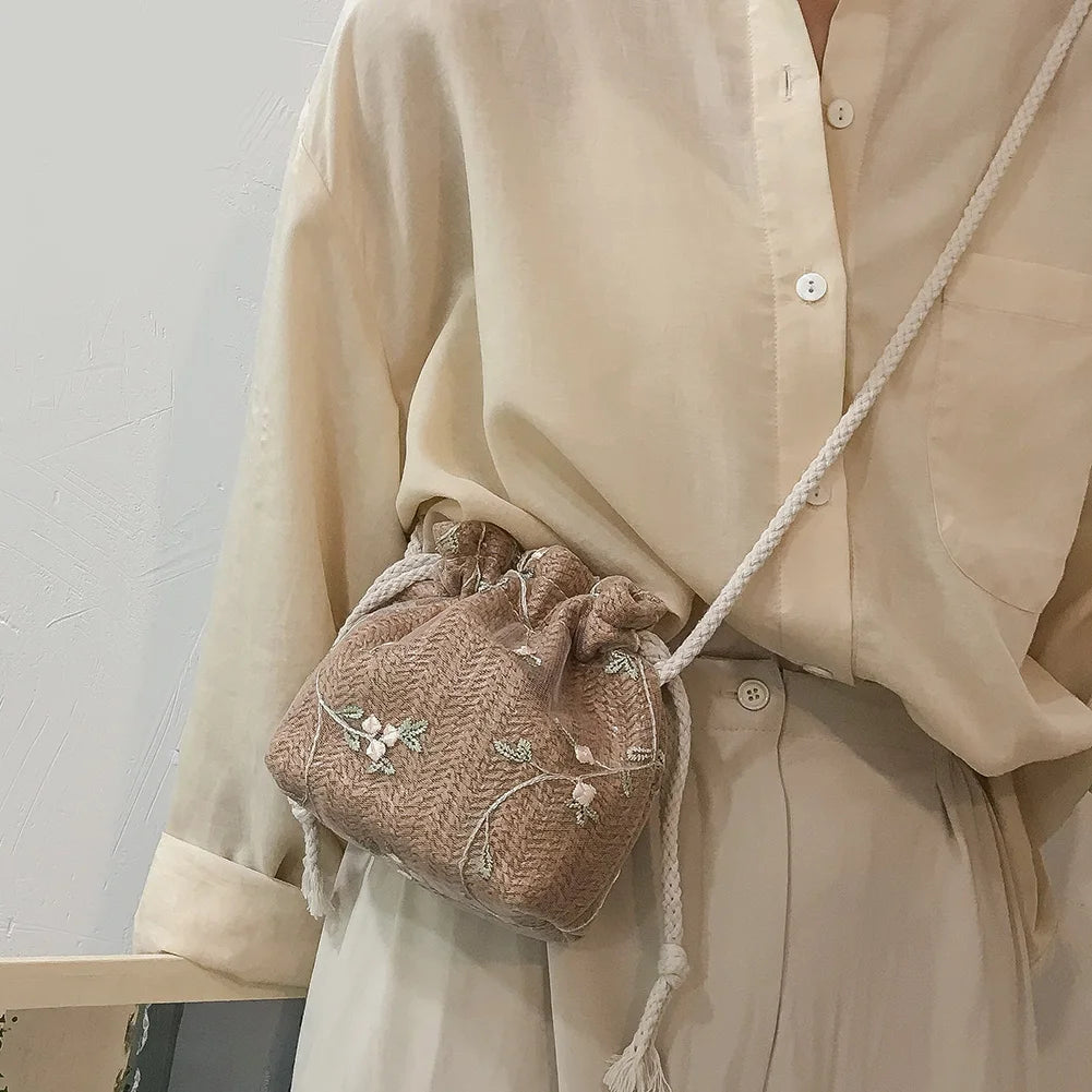 Straw Small Drawstring Crossbody Bags with Lace Flower Decor