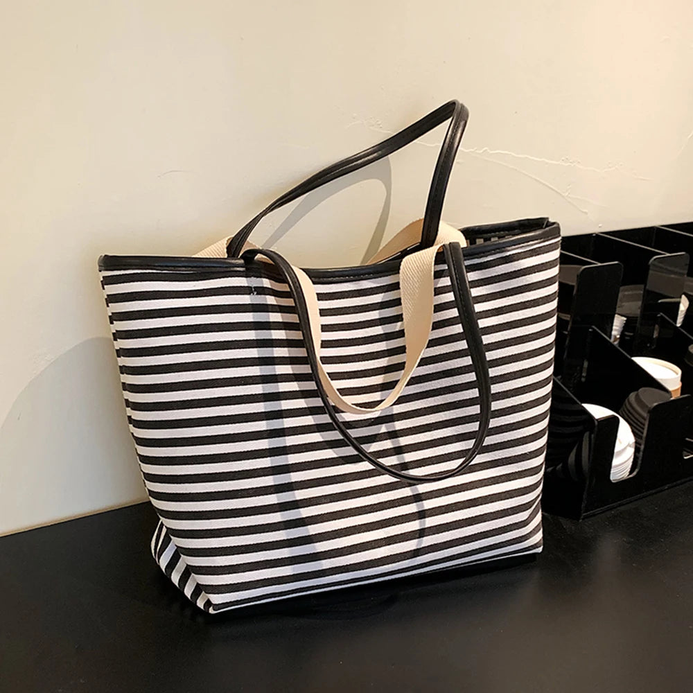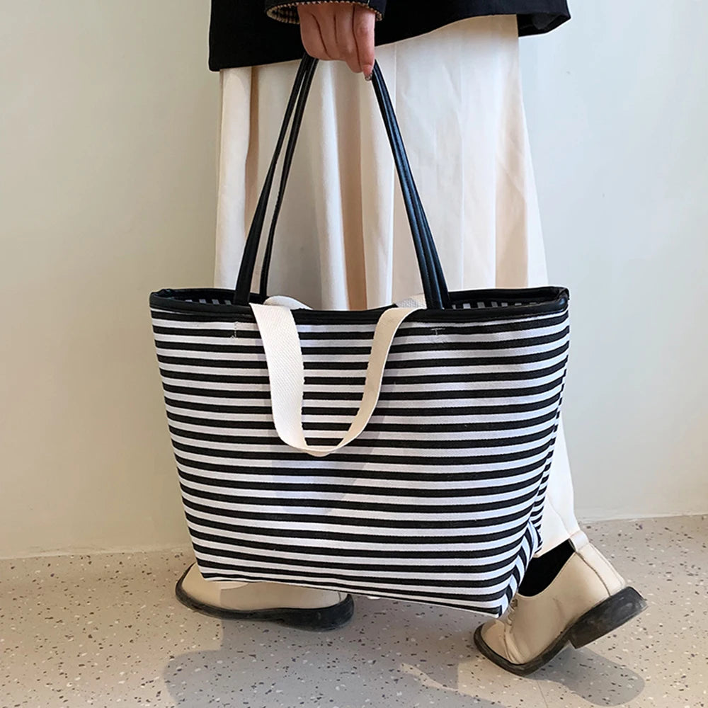 Striped Canvas Beach Bag with Pockets Waterproof Tote Bag