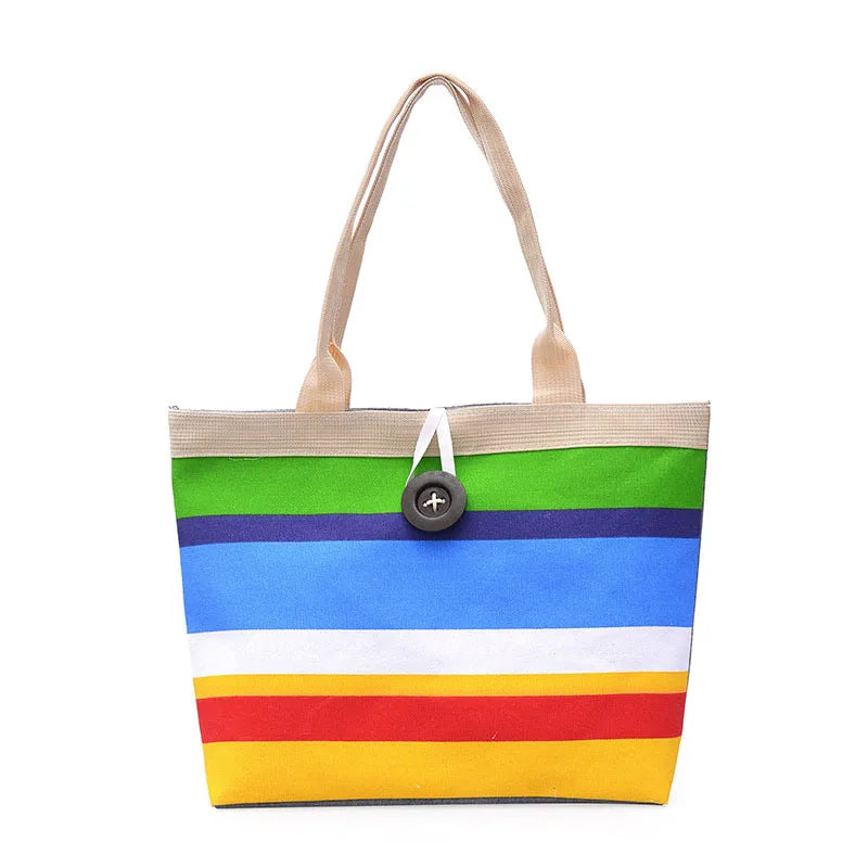 This colorful and spacious canvas tote bag is perfect for the beach, shopping, or everyday use. Its striped design adds a fun and stylish touch to your outfit.
