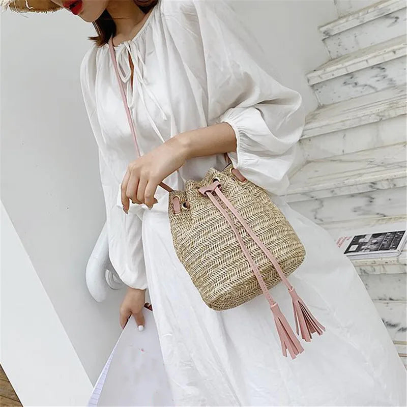 Summer Tassel Slung Shoulder Bag Retro Drawstring Bucket Handbag