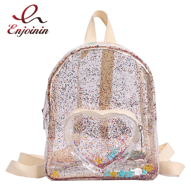 This dazzling backpack features transparent sequins and is made of waterproof PVC material, perfect for casual use, travel, or school. The jelly school bag adds a playful touch to your outfit.