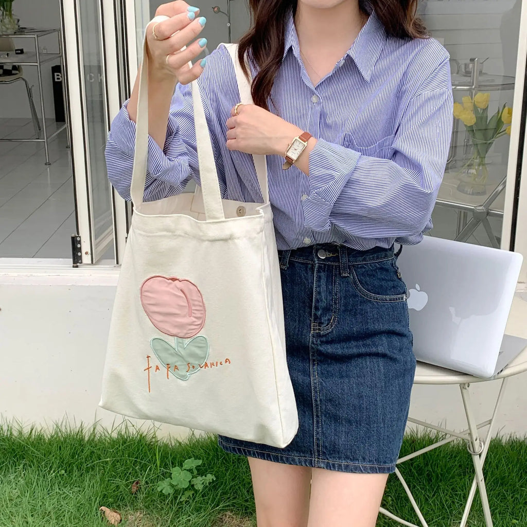 Tulip Embroidery Canvas Shoulder Bag Women's Casual Handbag Large Capacity Tote