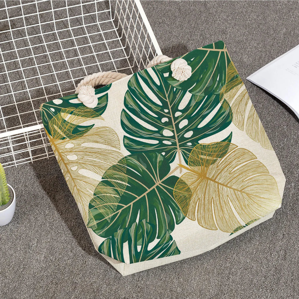Turtle Leaf Print Handbags Linen Women Tote Bag Plant Green Leaves Shoulder Bag