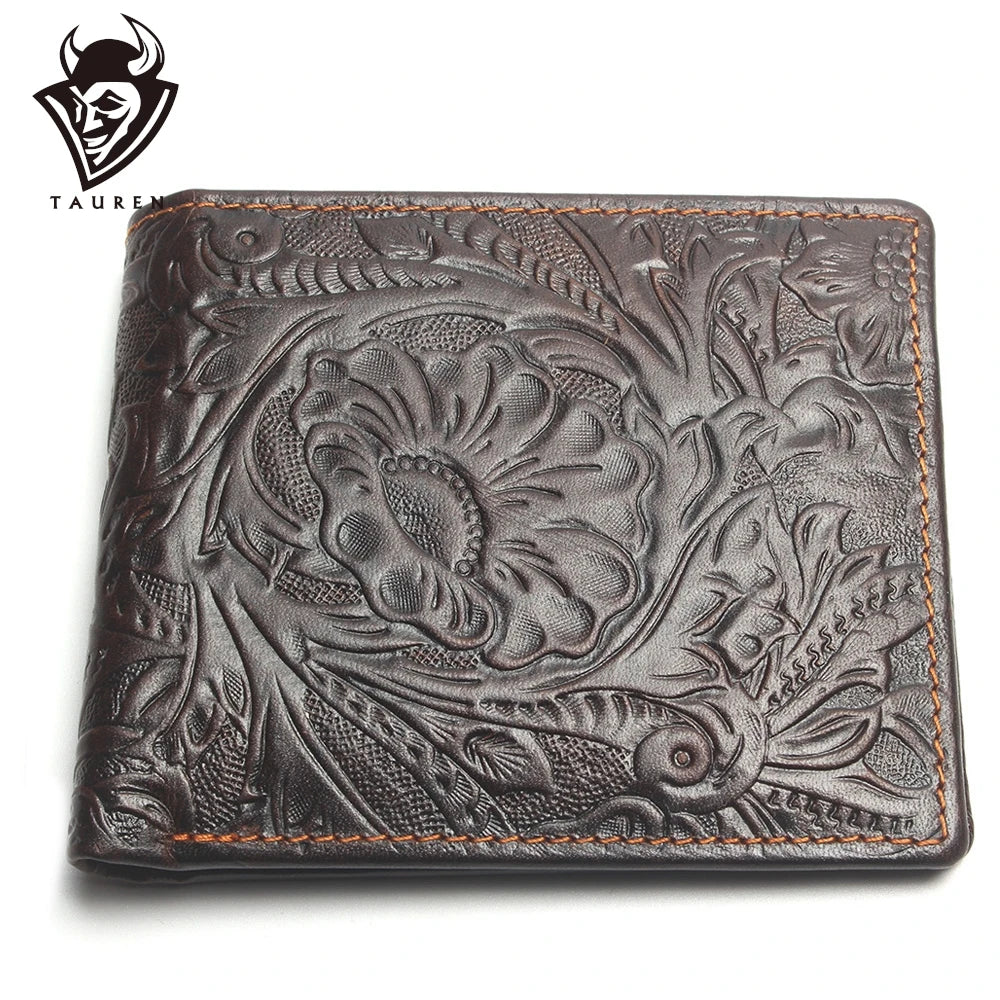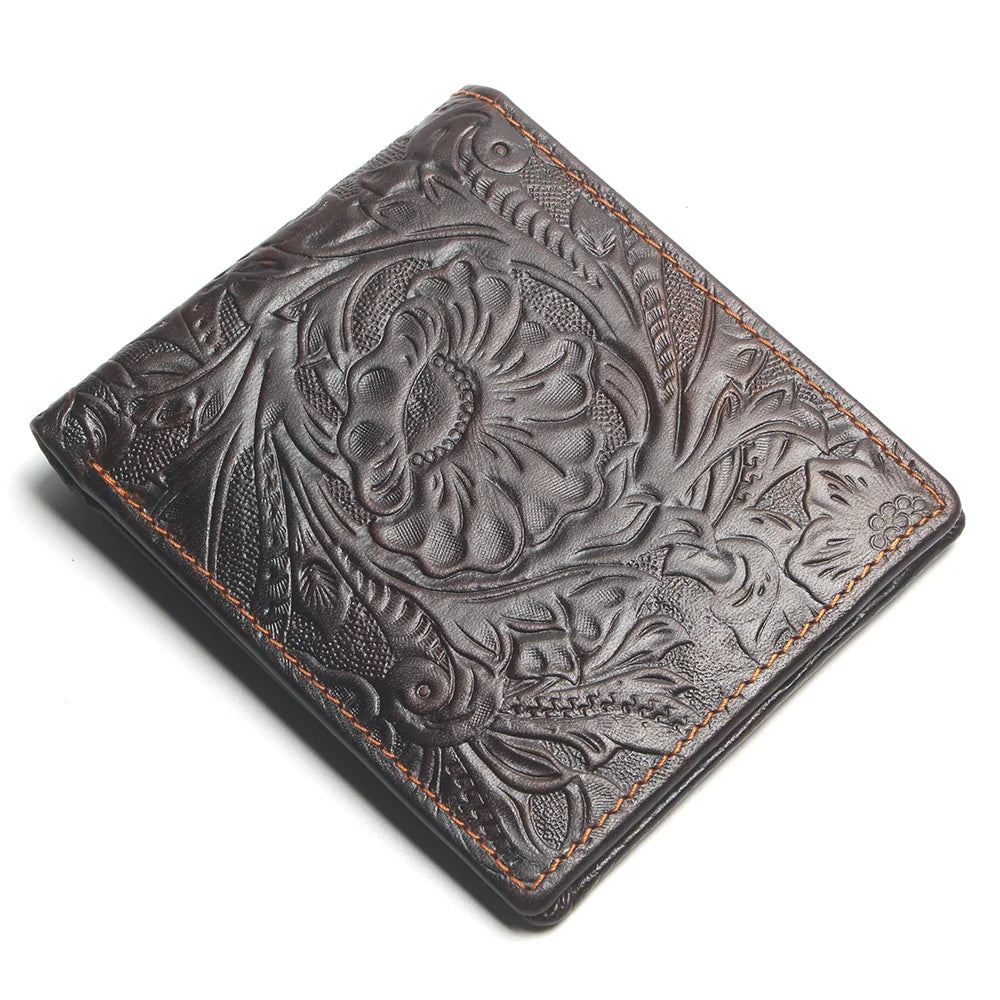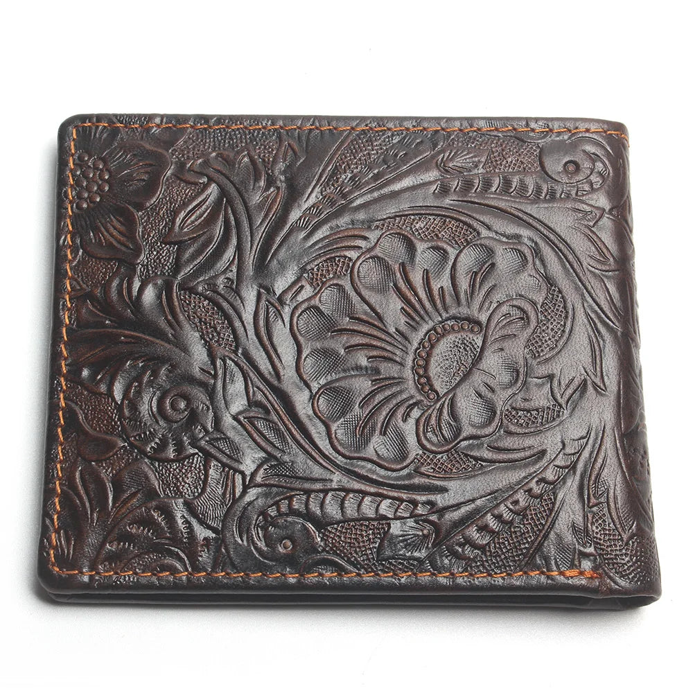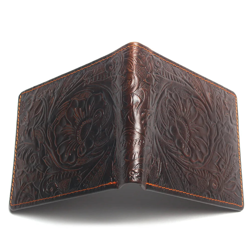 Vintage Cowhide Flower Wallet Men Leather Money Bag